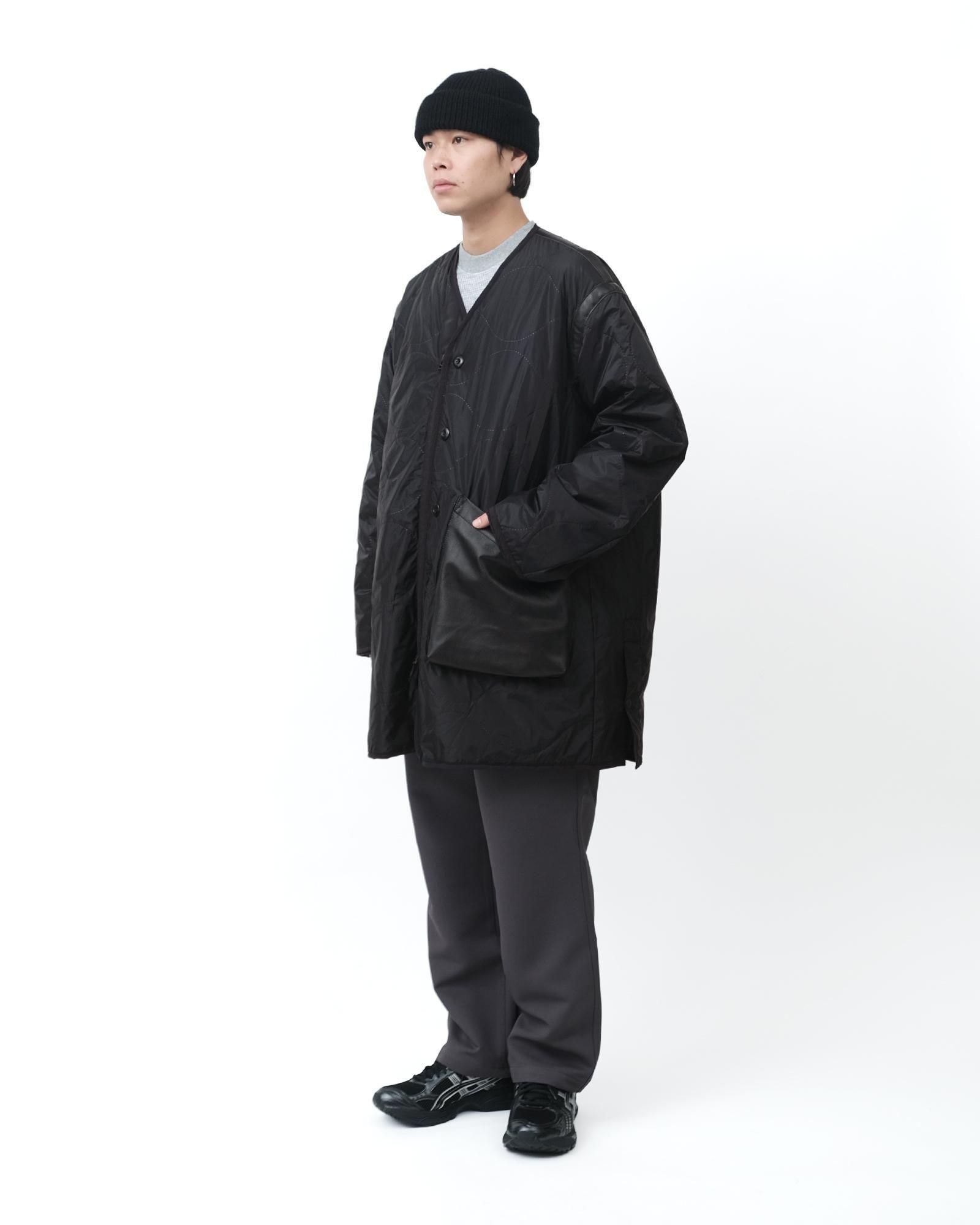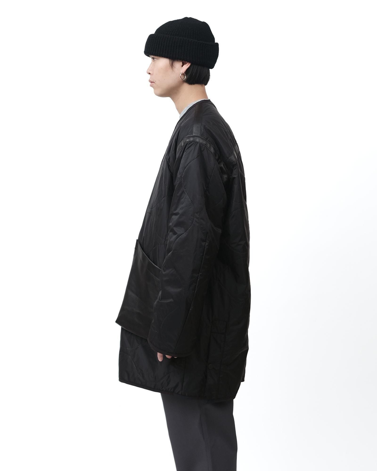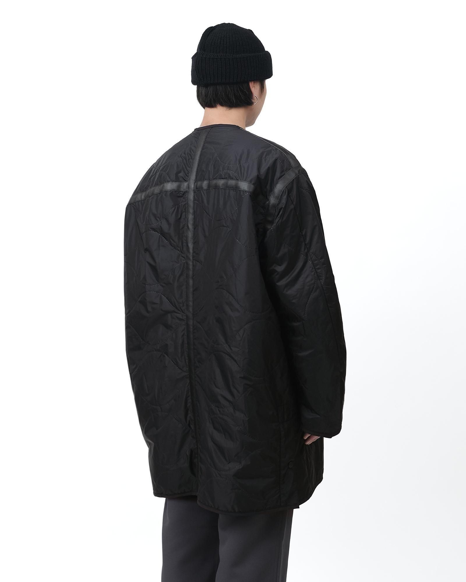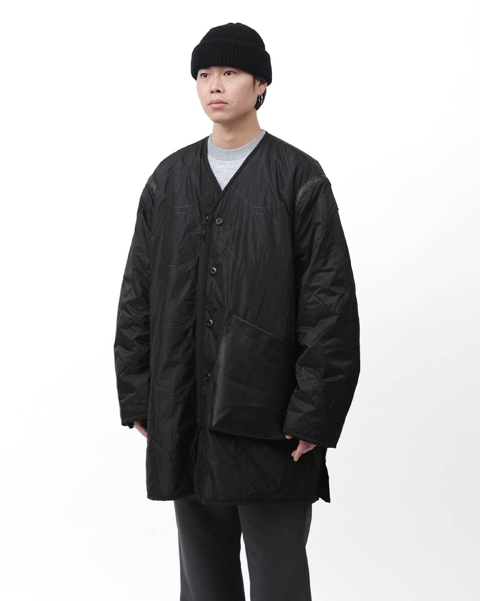 ミリタリーのライニングをベースとした中綿入りのトラベルコートは、宮下貴裕氏が前ブランドでリリースし、高い人気を誇っていたキルトライナーのアウターを思わせるデザイン。ショルダーやバックシーム、フロントポケットのレザー使いは宮下氏のデザインならでは。ナイロンリップに防水、防風フィルムを張り合わせ、サイズがデフォルメされた、ヘチマ柄の高周波キルトを施されています。