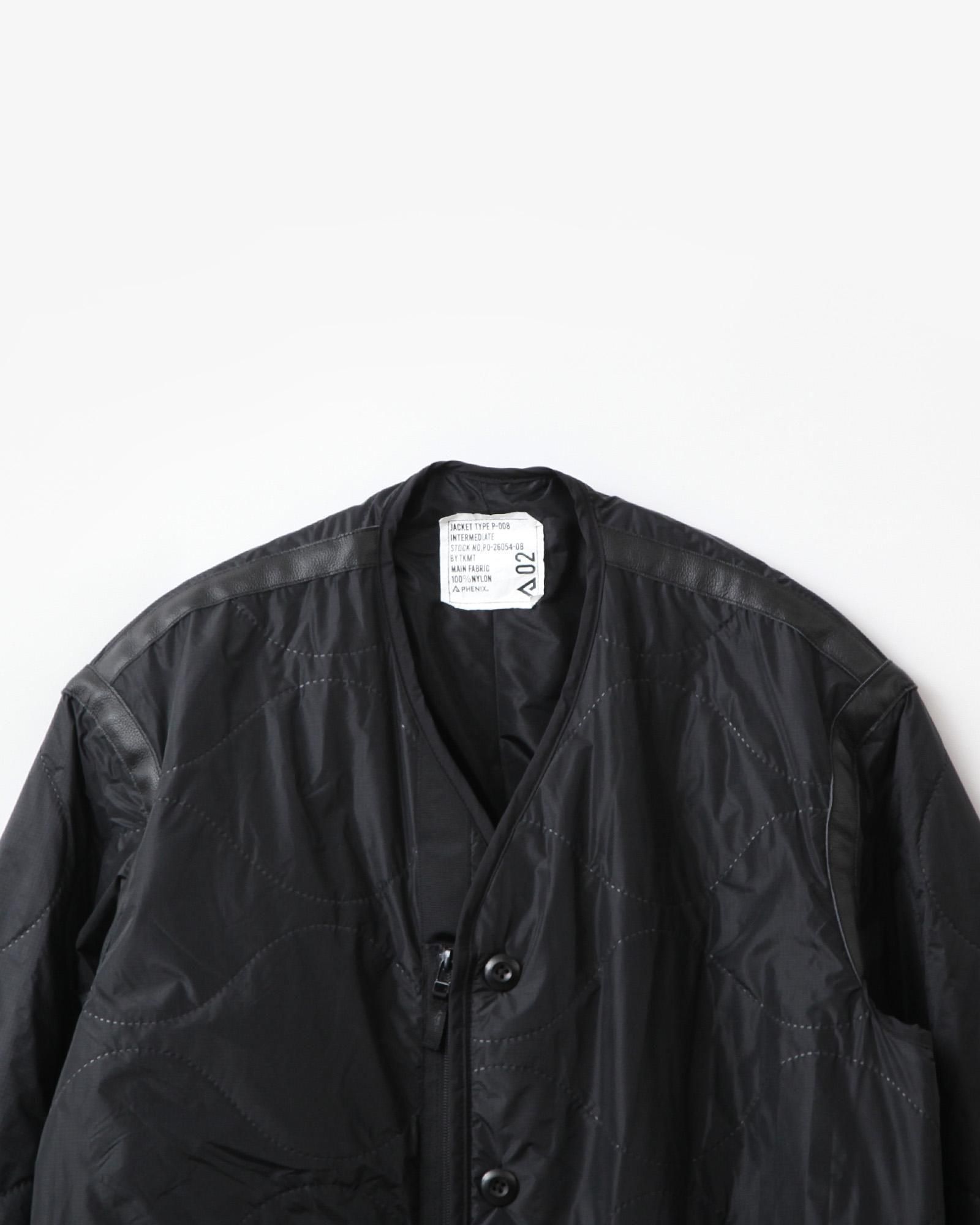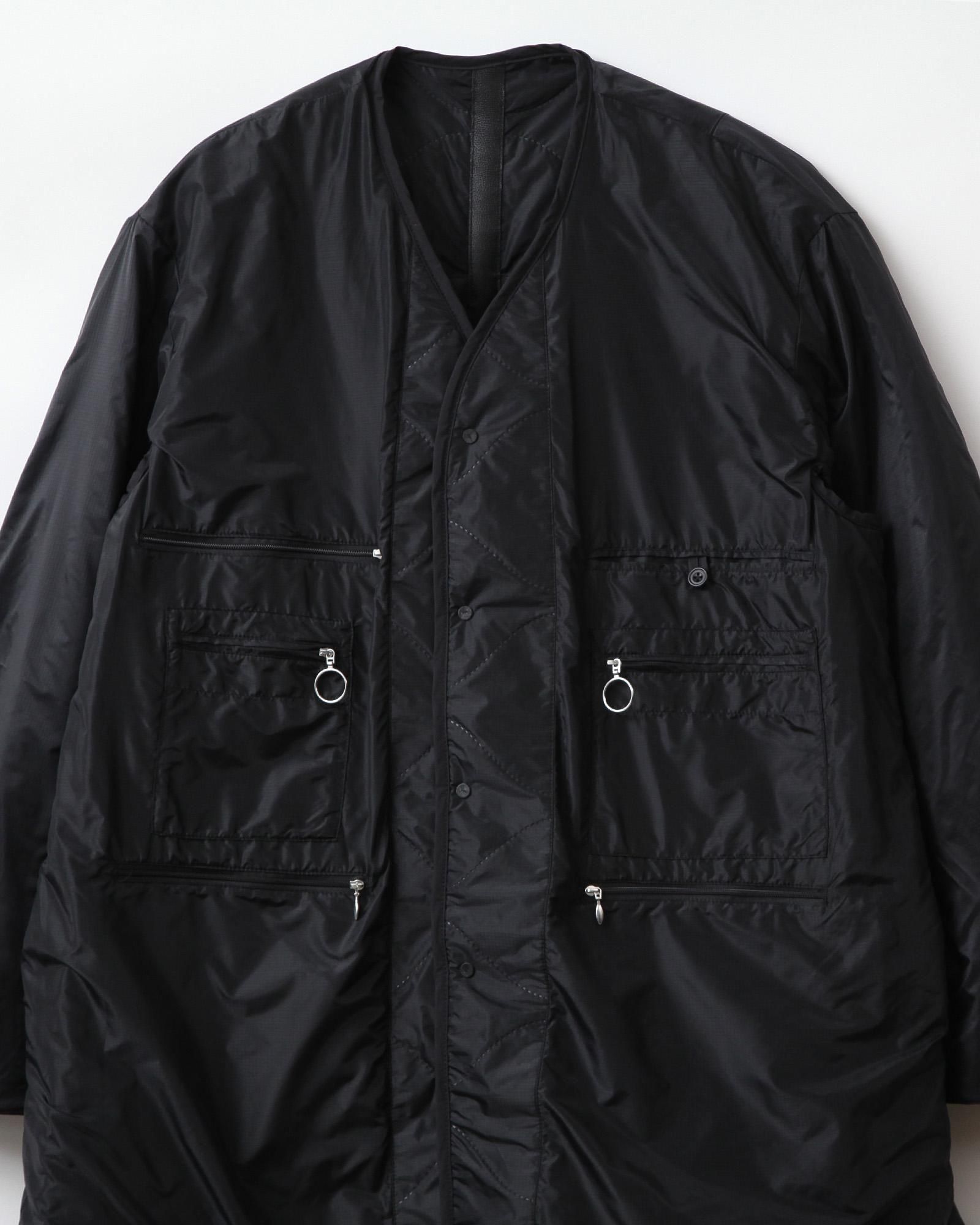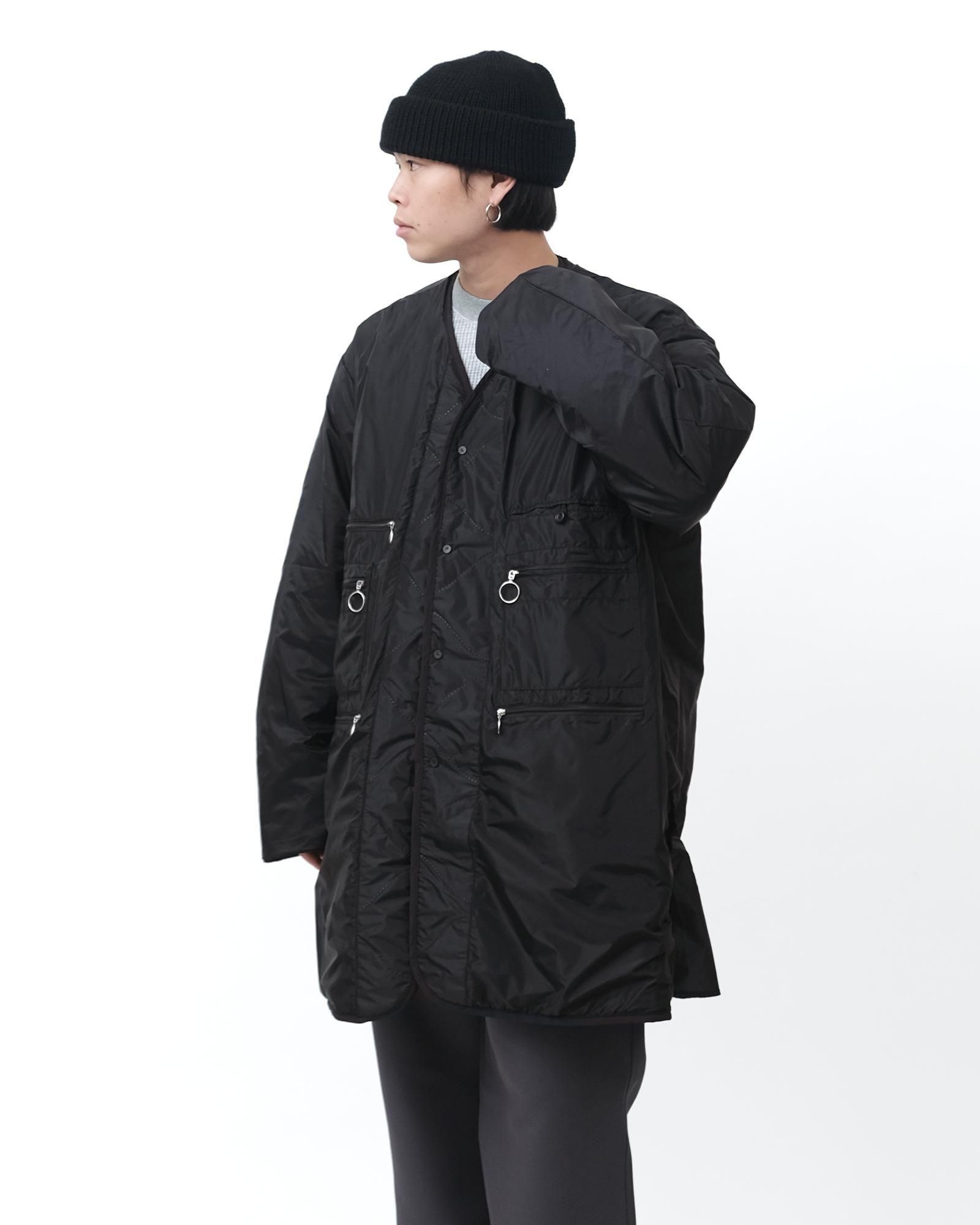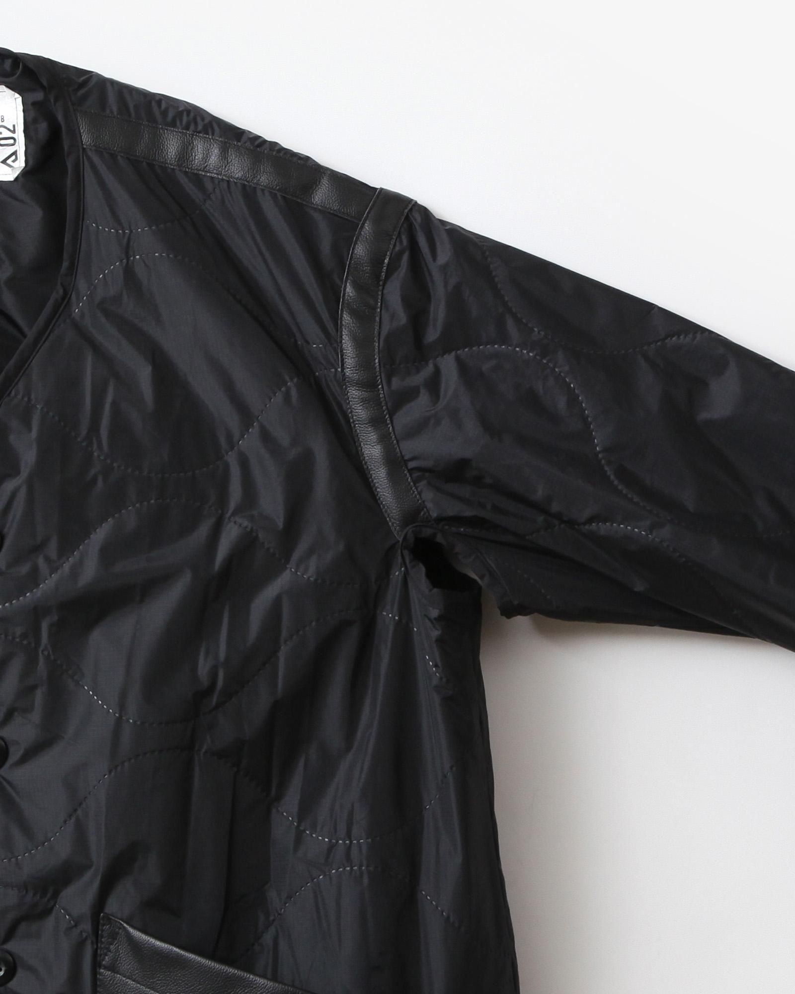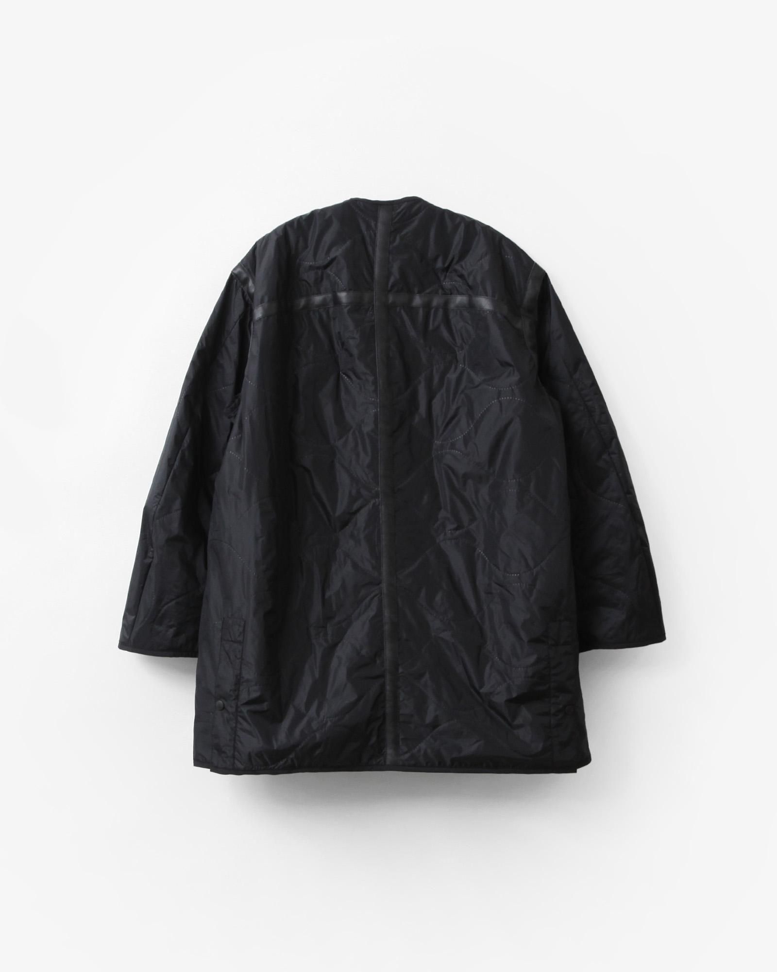 ミリタリーのライニングをベースとした中綿入りのトラベルコートは、宮下貴裕氏が前ブランドでリリースし、高い人気を誇っていたキルトライナーのアウターを思わせるデザイン。ショルダーやバックシーム、フロントポケットのレザー使いは宮下氏のデザインならでは。ナイロンリップに防水、防風フィルムを張り合わせ、サイズがデフォルメされた、ヘチマ柄の高周波キルトを施されています。